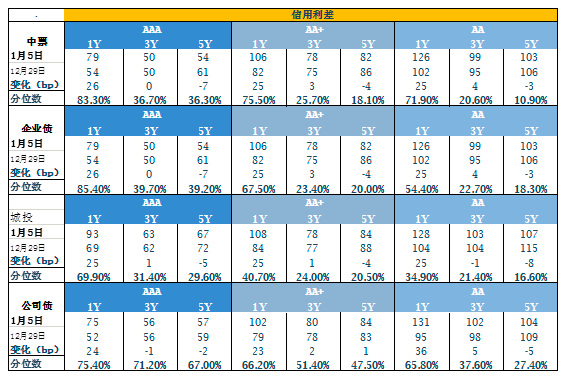 上周跨年紧张时点已过,资金全面宽松,资金价格大幅回落。年底财政陆续投放使得银行间流动性十分充裕,央行连续十日不开展逆回购操作,以回笼部分流行性。上周全周早盘伊始各期限资金即供给充裕,存款类机构大量融出,午盘后纷纷减点融出。具体看,央行上周净回笼5100亿元,前一周净回笼2900亿元。各期限资金利率整体下行,其中隔夜价格下行113.45BP,7天下行260.37BP,14天下行313.61BP,21天下行27.98BP。下周渐进月度中旬,缴税时点来临加上央行连续多日净回笼,预计资金面将有所收敛。尽管央行12月为确保市场平安跨年,通过SLF净投放一部分流行性,但并不改变货币中性和去杠杆的一贯宗旨,机构“滚隔夜”的成本和风险再提高,并且即使跨年风险无虞,结构性紧张的态势预计难以避免,建议机构提前做好流动性安排。