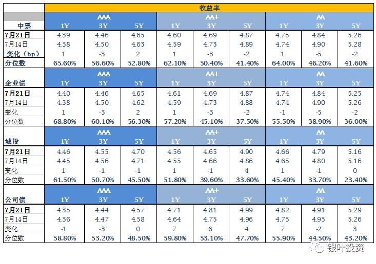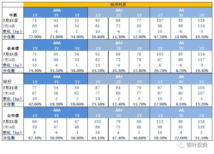 利率债方面,上周一宏观数据显示二季度GDP及工业增加值均好于预期,叠加资金面一度转紧后好转,以及市场对金融工作会议上的表态从乐观转中性,收益率波动几次转向,长端收益率走势基本呈现“N”字型;短端收益率更多受资金面影响,周一央行1400亿净投放以及对金融工作会议的乐观解读另政金债1Y期限下行6BP,随后资金面转紧以及监管各监管机构纷纷表态要防控风险,市场情绪降温,收益上行,到后半周在资金逐渐稳定市场情绪平复后,收益率再度下行。上周国债收益率曲线10Y收益率上行1.92BP至3.5829%,国开债10Y收益率上行1.38BP至4.1799%,农发债10Y收益率下行0.48BP至4.2532%,进出口行债10Y收益率下行0.93BP至4.2440%,地方政府债AAA曲线10Y收益率下行2.08BP至4.0829%。
