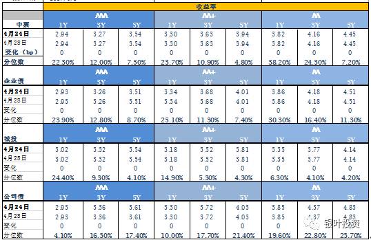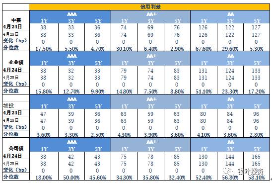 利率债方面,上周新发行15只利率债,为2只进出口行债,5只国开行债,6只农发行债和2只国债。周一农发需求很弱,受二级跌幅较大影响,15Y发行结果显著高于预期,发行利率高于二级成交价10BP;3Y 高估值1.7BP,和二级持平;7Y 高估值7BP。周二国开发行5Y倍数较好。周三3Y国债需求较弱,倍数低,中标利率加权高于估值6.7BP;国债近期招标结果较弱主要与4月放量发行和银行目前配置力量偏弱有关。下午农发需求较国债好转,10Y倍数较好,中标利率1Y 高于成交1.8BP;5Y 高于估值2.2BP,10Y和二级持平。周四口行招标需求好于预期,3Y较估值低2.6BP,5Y较估值低1.8BP;国开中标结果基本符合预期。周五发行3M贴现国债,中标利率略高于二级。