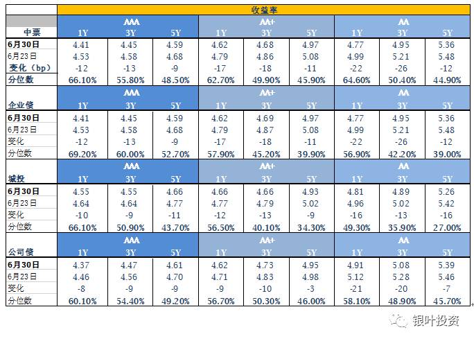 利率债方面,上半周在资金面宽松、央行去杠杆初见成效的表态以及工业数据未打破经济走弱的预期等利好因素刺激下,收益率连续下行,但下半周央行持续暂停逆回购操作,加上海外各大央行收紧货币政策的表态,市场乐观情绪逐渐消退,收益率回调。具体看,短端自6月央行没有跟随美联储加息,加上财政部“随买”操作、积极推进债券通等一系列操作引导下,自6月上旬高点已下行20-30BP。上周资金面整体宽松,1Y期限继续下行,国债1Y收益率下行4.57BP至3.46%,国开1Y期限下行16.08BP至3.8679%,口行和农发1Y分别下行11.98BP、10.99BP至3.9404%、3.9652%。上周5Y期限国债下行1.42BP至3.4931%,5Y国开、口行和农发分别下行0.36BP、7.87BP、7.37BP至4.1659%、4.1207%和4.1653%。长端10Y期限上周前半周快速下行,后半周回调基本全部回吐上半周积累。10国债10Y收益率上行2.26BP至3.5683%,国开债10Y收益率上行0.93BP至4.1987%,农发债10Y收益率下行1.37BP至4.3135%,进出口行债10Y收益率下行2.07BP至4.3199%。