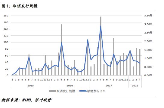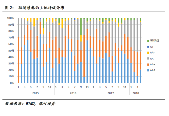 首先,我们从数据上去看2018年取消发行有哪些特点。从图1来看,取消发行从2016年11月开始明显放量,在2017年4月达到峰值之后,不论是绝对值还是比例都持续维持在高位。总体看,取消发行与整个债券市场的走势相关性较强。2018年以来,取消发行绝对量虽仍在高位,但占比呈下降趋势。