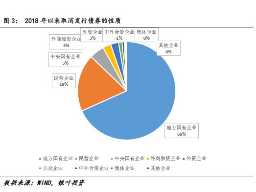 从以往情况看,通常有两种情形可能导致取消发行,一是发行人不满发行利率,通常是中高评级债券,对财务成本控制较严,将择机再发;二是发行人资质较差,募不满量。从图2取消发行的评级分布来看,18年以来明显AAA取消占比减少,而AA大幅增加,说明第二种情形的比例在提高。另从图3看,18年以来取消发行的主体中地方国企占比最高在68%,其次是民营企业占比19%,地方国企多数为中低评级的平台公司,进一步印证了18年以来取消发行的主因是投资者对中低评级城投和民企的规避情绪。
