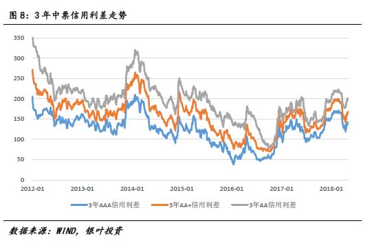 高低等级信用债分化的起点是供给侧改革带来过剩产能去杠杆,主要表现为民企衰退同时国企恢复元气,另外叠加去年几家大型民企的事件风险,使得整个市场对民企的认知恶化,传导到金融机构行为,尤其是银行,进而是债市,整个融资环境恶化。这里更深层次的原因是中性偏紧的货币政策,资管新规促表外回归表内,导致资金有限,有限的资金配置到更安全的资产上也是自然而然。另外,从政策层面上,国家对地产和城投这两大存量债券占比较高的发行主体的融资做出了各种限制,加重了信用债的等级分化。从整个市场环境看,短期内看不到上述因素的边际转变,只有当整体融资环境宽松,中低等级主体的再融资能力有保障,分化才可能有所转变。