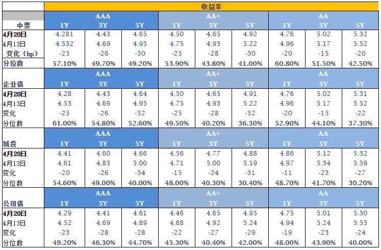 上周新发行利率债3389.3亿,到期1006.7亿,利率债净供给2382.6亿。从清明节后,利率债供给明显放量,但整体需求较好,招标倍数较前一周稍弱,显示需求有边际转弱迹象,可能与资金面紧张有关。二级市场十年国债收益率累计下行18.47bp至3.52%,十年国开收益率累计下行22.08bp至4.36%。周二晚间央行宣布降准100bp,释放4000亿资金,大超市场预期,当晚夜盘215即下行10BP,周三继续大幅下行,国债期货大涨1.05%,下午传言资管新规延期发布,进一步助推行情,不过当日晚间澄清延期不属实。周三多头趁机兑现浮盈离场,叠加资金面紧张的因素,周四周五两天市场明显冷静,收益率小幅上行。