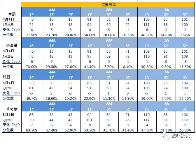 上周央行在跨月时点连续三天零投放,前半周资金面较预期紧张,后半周转松,短端收益率随之小幅下行。经济基本面,周一PMI数据公布,显示7月经济保持坚挺,建筑业表现强劲,市场预期三季度经济仍有较好表现,且商品继续上涨,市场风险偏好上升,债市情绪欠佳,长端收益率小幅上行2-5BP左右,后半周维持震荡。信用债短端约下行2BP左右,中长端涨跌互现,城投债表现欠佳,收益率普遍上行5BP左右。