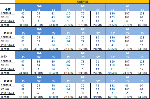 上周资金面宽松程度超出预期,市场之前对资金面预期较谨慎,一方面是预计两会闭幕后资金面会随之收紧;另一方面,上周三召开的美联储3月FOMC会议,市场担心会议是否会透露出今年加息次数超过3次的信息,以及央行跟随美联储加息操作的严厉程度。然而两会闭幕后资金面延续了宽松态势,且国内央行上调逆回购利率5个基点的跟随操作基本属于象征性操作,较预期温和,资金面进一步宽松。上周已有机构陆续跨季,周初资金面不确定性较大,跨季资金价格较高,之后随资金面超预期宽松,跨季资金价格大幅下行,周五非银报跨季价格已下到5%以下,较上半周下降50BP以上,且以公募基金为主的非银机构大量融出,需求则有所下降。具体看,公开市场操作方面,由于银行流动性总量处于较高水平以及月末财政支出增加影响,上周净回笼3200亿。资金价格上,R001基本持平上周在2.6%,R007周二上行15BP后逐渐下行,周五较前一周五下降3BP至3%;跨季期限由21D变成14D,价格从5左右下降20BP至4.8%。