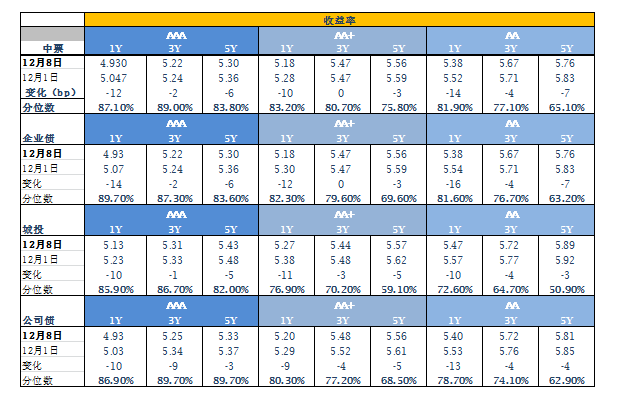 尽管央行大额净回笼,但受益于11月底财政投放力度较大,上周整体继续维持宽松,长短端资金价格走势分化,1个月以内的资金价格明显回落,DR001 中枢下移至2.6%附近,DR007下移至2.9%附近,相比前一周有分别有约20BP和10BP的下降。但1个月及更长期限的跨年资金则出现的较大幅度的抬升,DR1M周五加权在5.0%,较前一周提高50BP左右。公开市场,上周到期逆回购7800亿,央行仅在周四投放了2700亿,其他四天零投放,另外周三到期1年期MLF1880亿,央行完全对冲,整周实现净回笼5100亿。值得关注的是央行此次并未一次性对冲整月的MLF到期量,本周六还将有1870亿的1年MLF到期,引发市场情绪转向谨慎,但随后央行在金融时报对这一行为的进行了解释,阐明分两次对冲主要是避免流动性的过于宽松,市场对这一解释显然比较认可,随后市场情绪恢复。本周关注央行操作及缴税因素对资金面的影响。