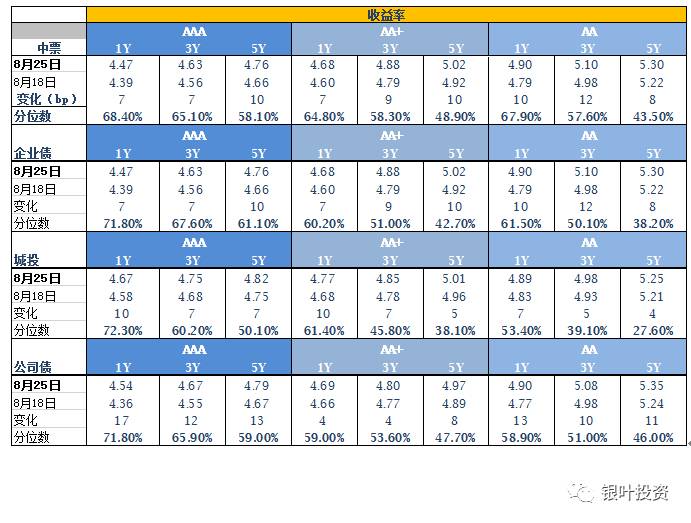 二级市场:上周信用债各等级期限收益率整体上行。受利率债持续上行,高等级短端收益率上行7-10BP信用利差收窄,中长期期限除城投债外,均上行8BP及以上。中低等级城投债表现相对较好,上行幅度低于同等级中票、企业债和公司债。中债中短期票据AAA曲线5Y收益率上行10BP至4.76%,中债企业债AAA曲线5Y收益率上行10BP至4.76%,城投债AA曲线5Y收益率上行4BP至5.25%。公司债AA曲线3Y收益率上行10BP至5.08%。同业存单AAA曲线3M收益率上行6BP至4.46%。