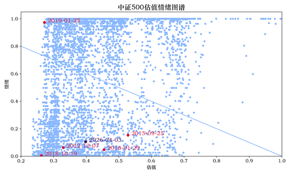 上证50: -0.24% ,沪深 300 : -1.37% ,中证 500 : -2.62% ,中证 1000 : -2.71% ,创业板指: -4.44% ,全 A : -2.21%成交金额排名top5%股票的占比之和(20日平滑)计算方法为全A等权计算的 EP-10年期国债收益率,反映了股票回报率和债券回报率的差值,反映股票市场给出多少的风险溢价补偿。通常该指标会区间波动,在极值点有较强的参考意义。资产比价:全A 等权的 EP 对 10 年国债的风险溢价历史情况反映中证500历史各期估值与情绪的相对位置,横轴为估值的代理指标PB,纵轴为构造出的500情绪指标